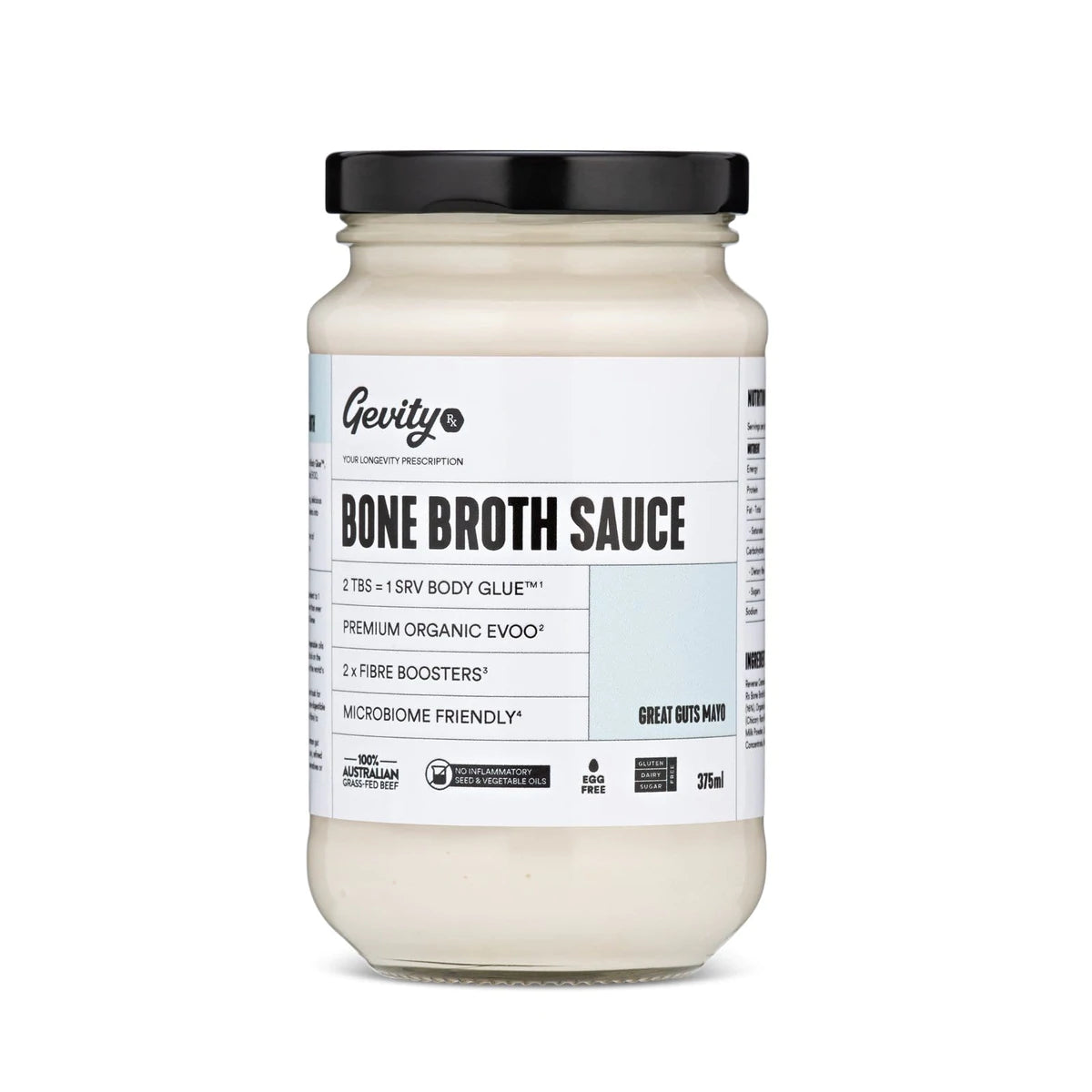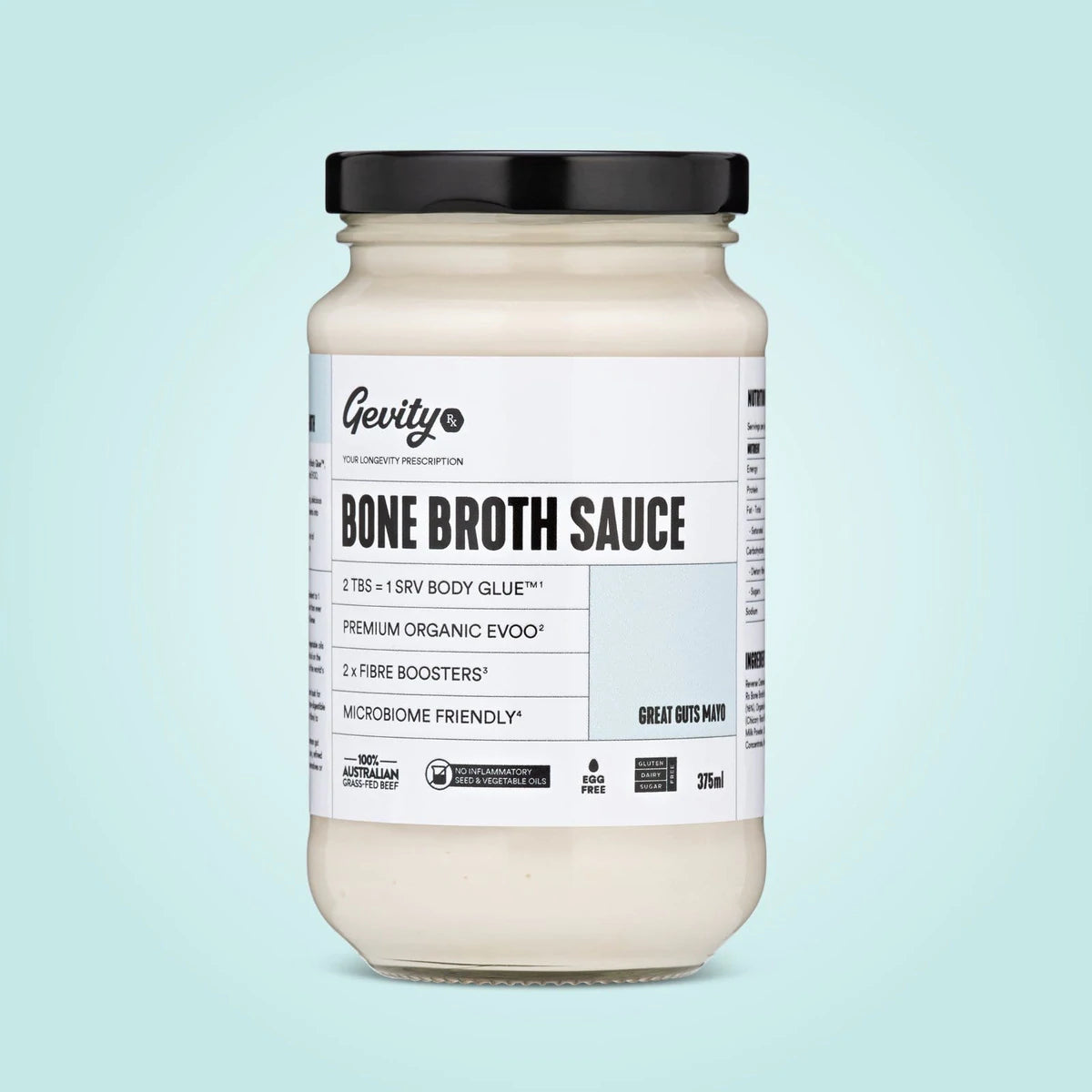 Ever heard of a gut-friendly mayo? Well, you have now! Our super creamy and Great Guts Mayo is the easiest way to incorporate nature's best ingredients into your whole family's diet. Not only does every tablespoon of sauce contain a whole serve of the world’s most nutrient dense bone broth, but it’s also made with Organic EVOO, Organic Psyllium Husk and Organic ACV and it’s packed with prebiotic fibre to feed your good gut bugs!