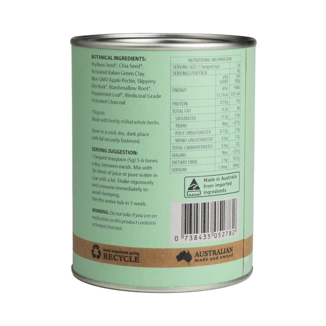 Psyllium Seed*, Chia Seed*, Activated Italian Green Clay, Non-GMO Apple Pectin, Slippery Elm Bark*, Marshmallow Root*, Peppermint Leaf*, Medicinal Grade Activated Charcoal