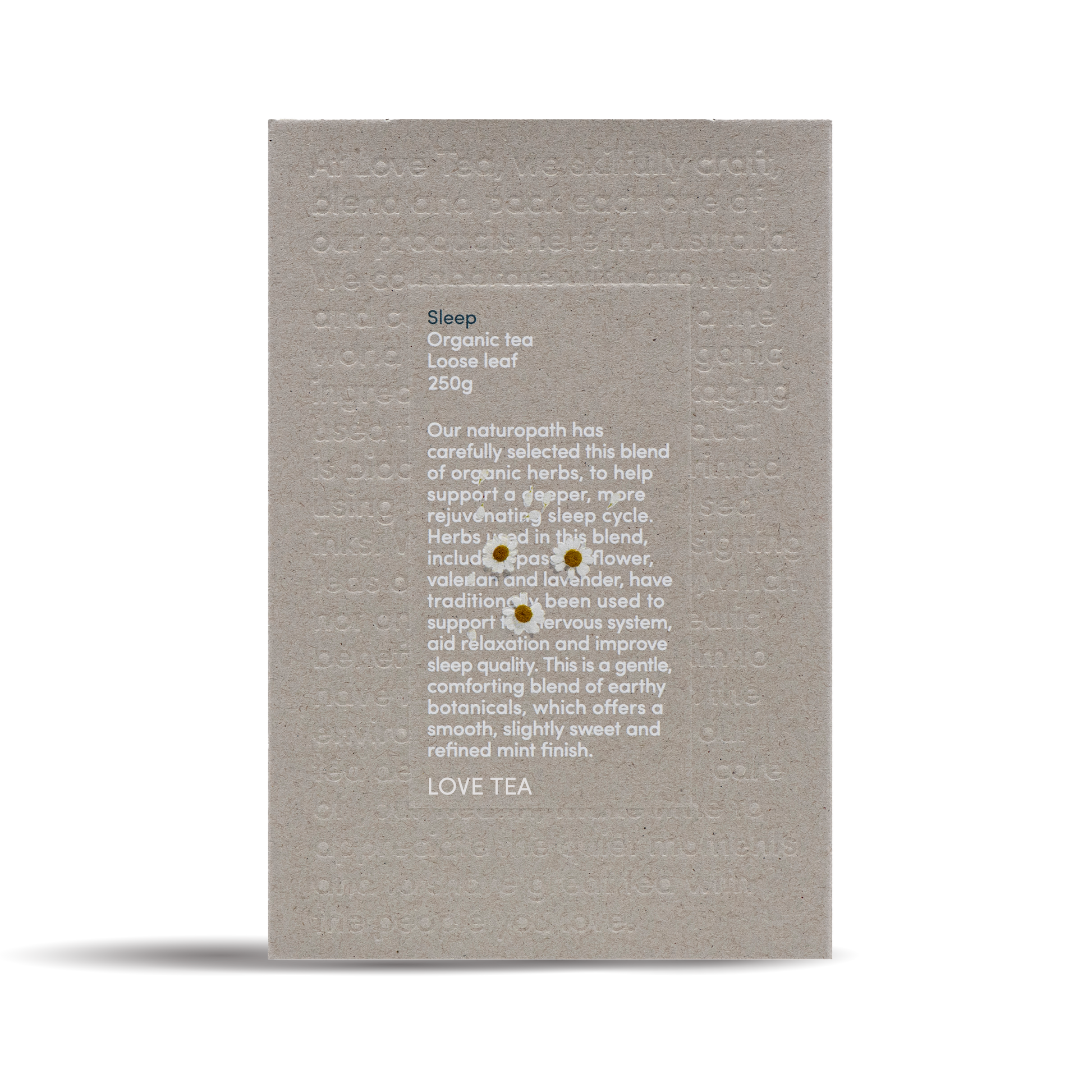 Our naturopath has carefully selected this blend of organic herbs, to help support a deeper, more rejuvenating sleep cycle. Herbs used in this blend, including passion flower, valerian and lavender, have traditionally been used to support the nervous system, aid relaxation and improve sleep quality. This is a gentle, comforting blend of earthy botanicals, which offers a smooth, slightly sweet and refined mint finish.