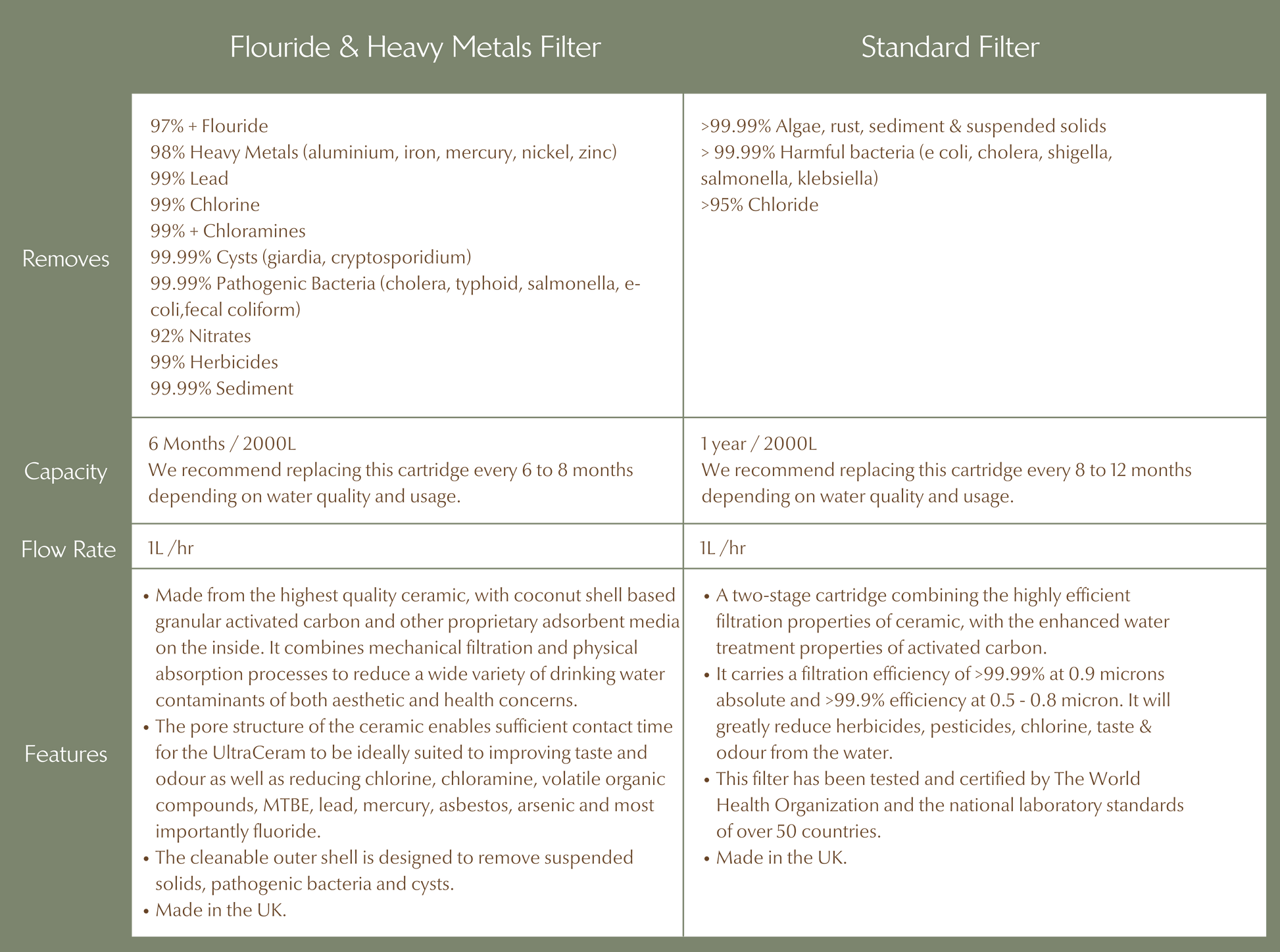 The combination of ultra-fine ceramic and quality carbon block guarantees absolute sub-micron filtration, superior removal of contaminants and great tasting drinking water.